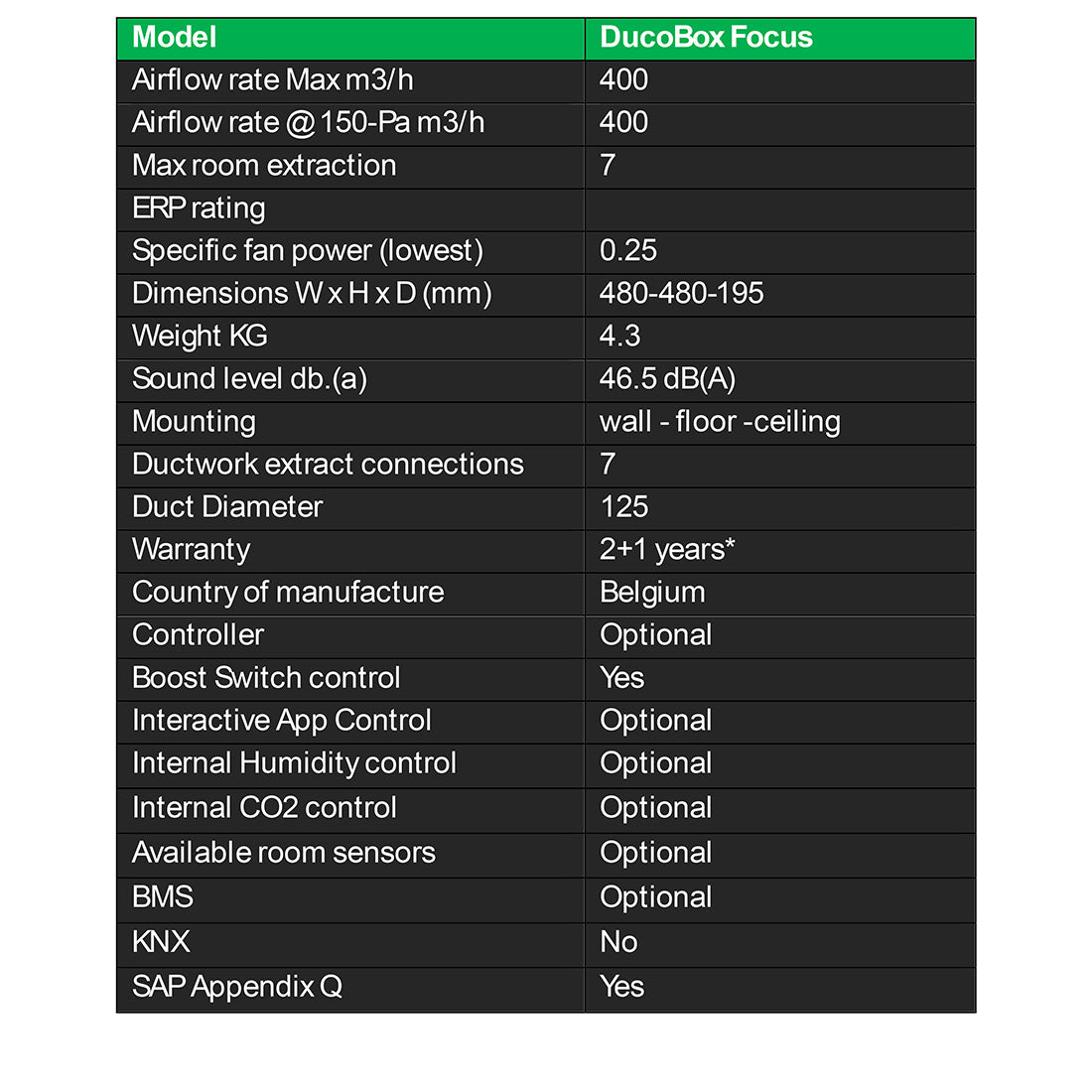 The DucoBox Focus DCV is the highest specification Smart demand controlled MEV unit available from Duco that extracts continually from the kitchen and bathrooms to one central unit to provides a quiet and efficient ventilation system
