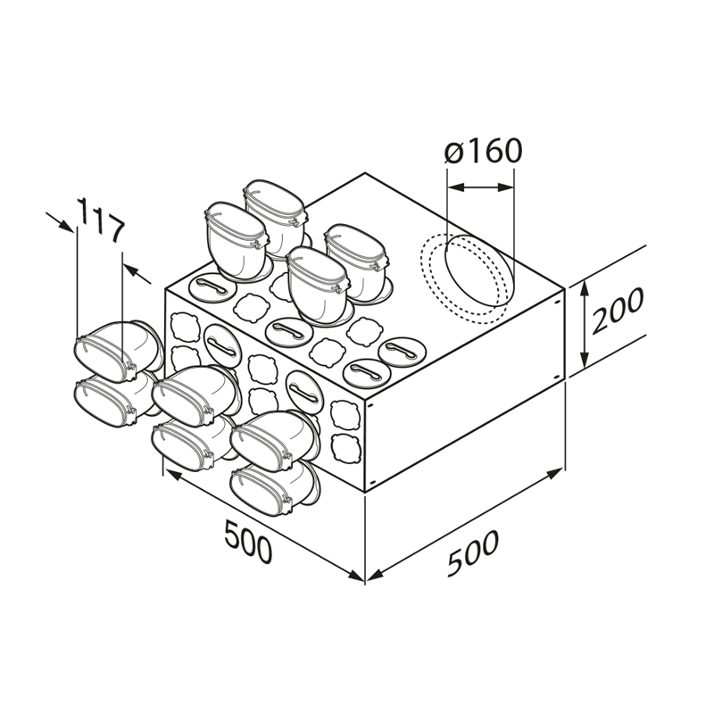 The Airflow Airflex 10-Point Oval Distribution Box is a high-quality galvanised steel component designed for superior airflow in ventilation systems. Featuring internal acoustic insulation, it reduces noise while offering 10 versatile connections for vertical or horizontal 75mm round pipes. The rear 160mm spigot ensures a secure connection, making it ideal for a variety of installations.
