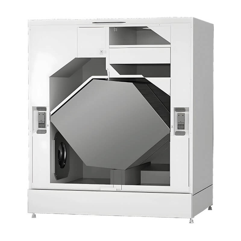 This unit has a high-quality PVC counterflow heat exchanger with a 90% thermal efficiency protected with high-capacity filters on each side