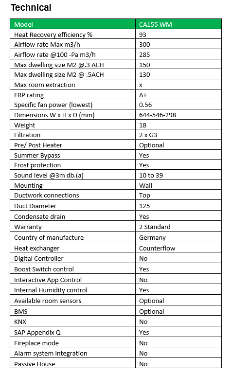 Zehnder ComfoAir 185 WM for wall or cupboard mounting