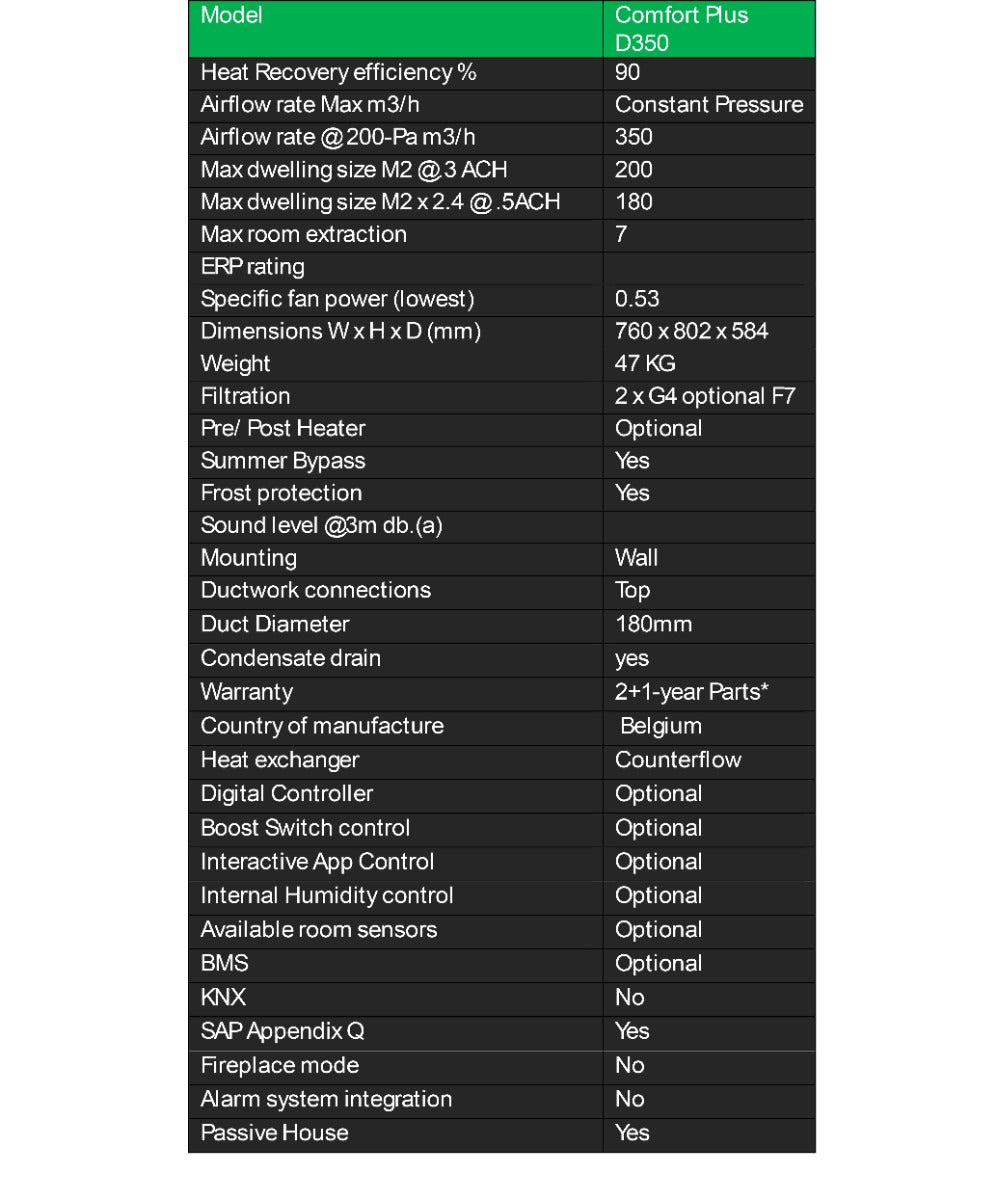 The DucoBox Energy Comfort Plus D350 is a high quality MVHR unit manufactured in Belgium and developed with the aim of guaranteeing an even quieter operation with an option of 2 zone ventilation