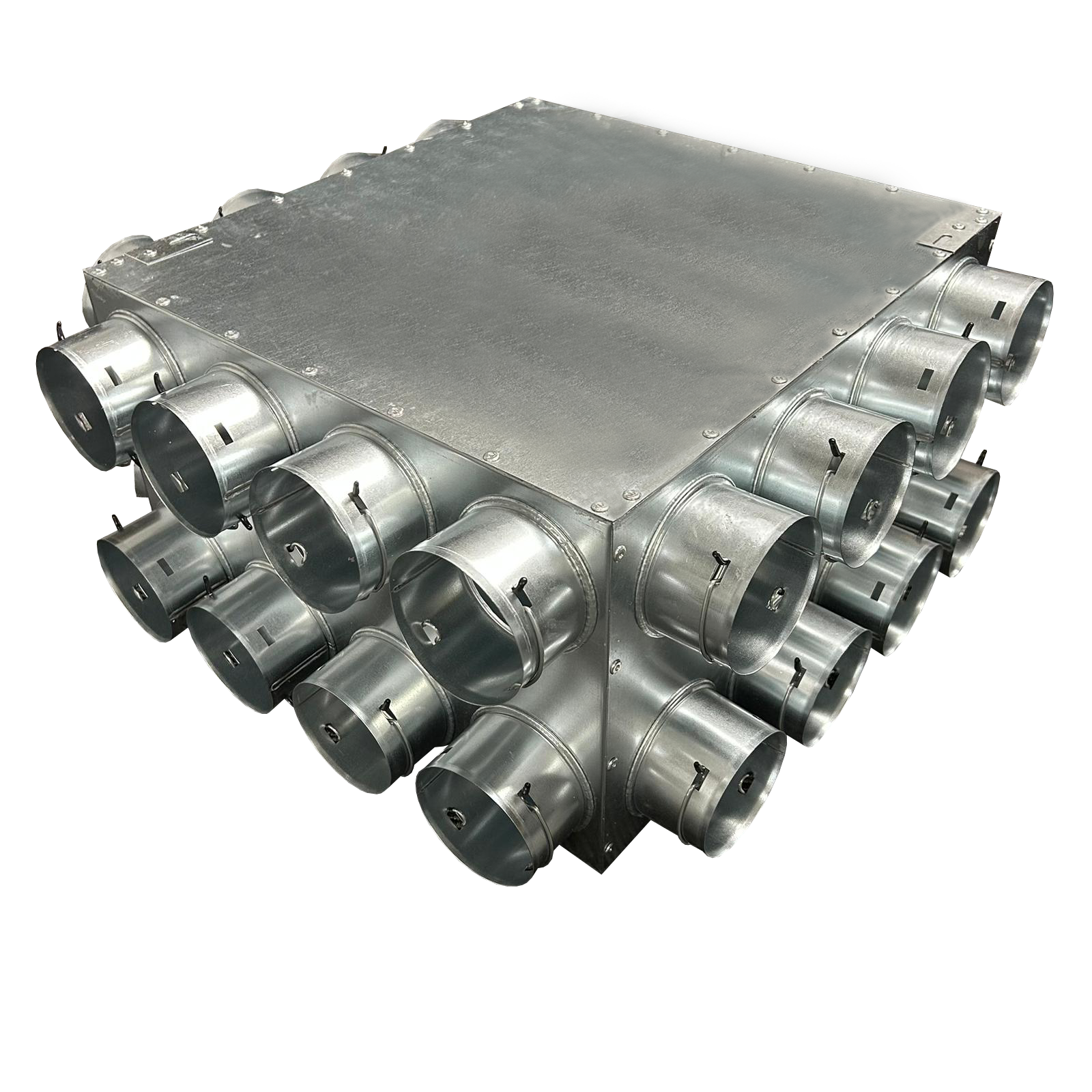 Its adjustable design allows for flexible installation in ceilings, floors, or service voids, while the 200mm spigot ensures a secure connection to the main ductwork. Supplied with 6 blanking caps, unused outlets can be sealed to maintain optimal system efficiency and airflow control.